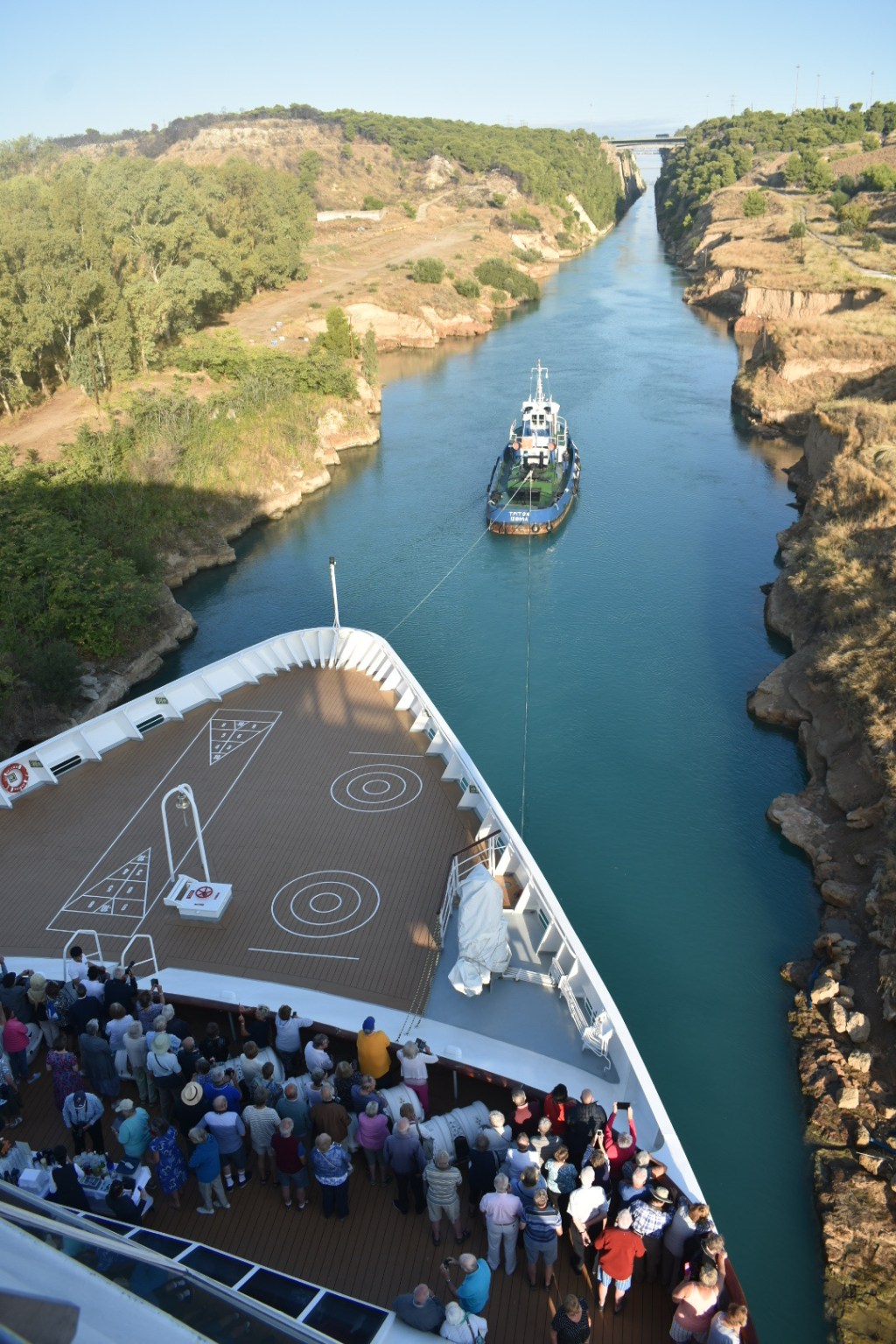 Now I must admit before I got on this cruise I had never heard of the Corinth Canal and was most excited about the hot weather and the Greek cuisine however, after a few days of being on board I realised that this was quite an interesting cruise. It had been sold out a couple of years in advance (rumour on board has it that it sold out in 2 days) and there was a hub of excitement among the passengers. It wasn’t until talking to some of the passengers and also listening to the lecture given by the Captain that I realised that this cruise was going to make history. We were going to be the largest ship to ever to sail through the Corinth Canal! This may not sound like a big deal but considering the width of the canal is 24 m and the MS Braemar is 22.5 m wide it starts to sound slightly more exciting!